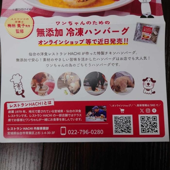宮城県仙台市の有名なハンバーグレストラン店HACHIさんのわんこ用ハンバーグのお手伝いをさせて頂きました。ATOM'S KITCHENのネットショップでも販売スタートです!